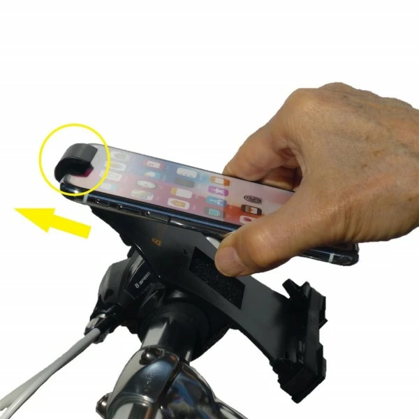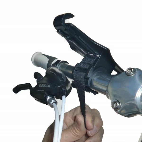Mit einer Hand lässt sich das SmartPhoneleicht und bequem einsetzen und entnehmen. Das SmartPhonewird oben in den Halter eingehakt, mit sanftem Druck nach unten arretiert und sitzt stabil und sicher -auch auf schlechten Fahrwegen und im Gelände. Der starke Klettverschluss mit Elastomersockelpasst auf jede Lenkerform und lässt sich einfach und schnell am Lenker befestigen und wieder abnehmen.