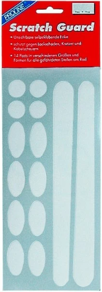 PROLINE SCRATCH GUARD Set – Unsichtbare selbstklebende Folie. Schützt gegen Lackschäden. Kratzer und Kabelscheuern am Rad. 14 Pads in verschiedenen Größen und Formen für alle gefährdeten Stellen am Rad.